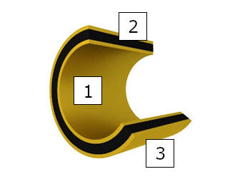 Труба с тремя соэкструзионными слоями: внутренний (маркерный) слой из полиэтилена ПЭ 100 желтого цвета, средний слой из полиэтилена ПЭ 100 черного цвета и наружный (маркерный) слой из полиэтилена ПЭ 100 желтого цвета.